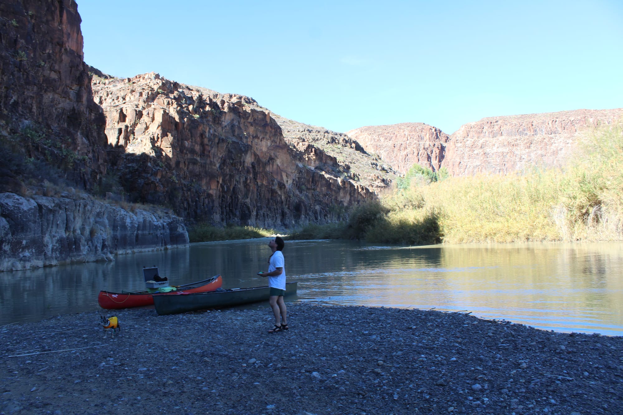 Alexander Neal of the Texas Rivers Protection Association and Stan, a dog, survey the cliffs at the entrance to Colorado Canyon, roughly where the Presidio County border wall projects end. (Photo credit: Sam Karas)