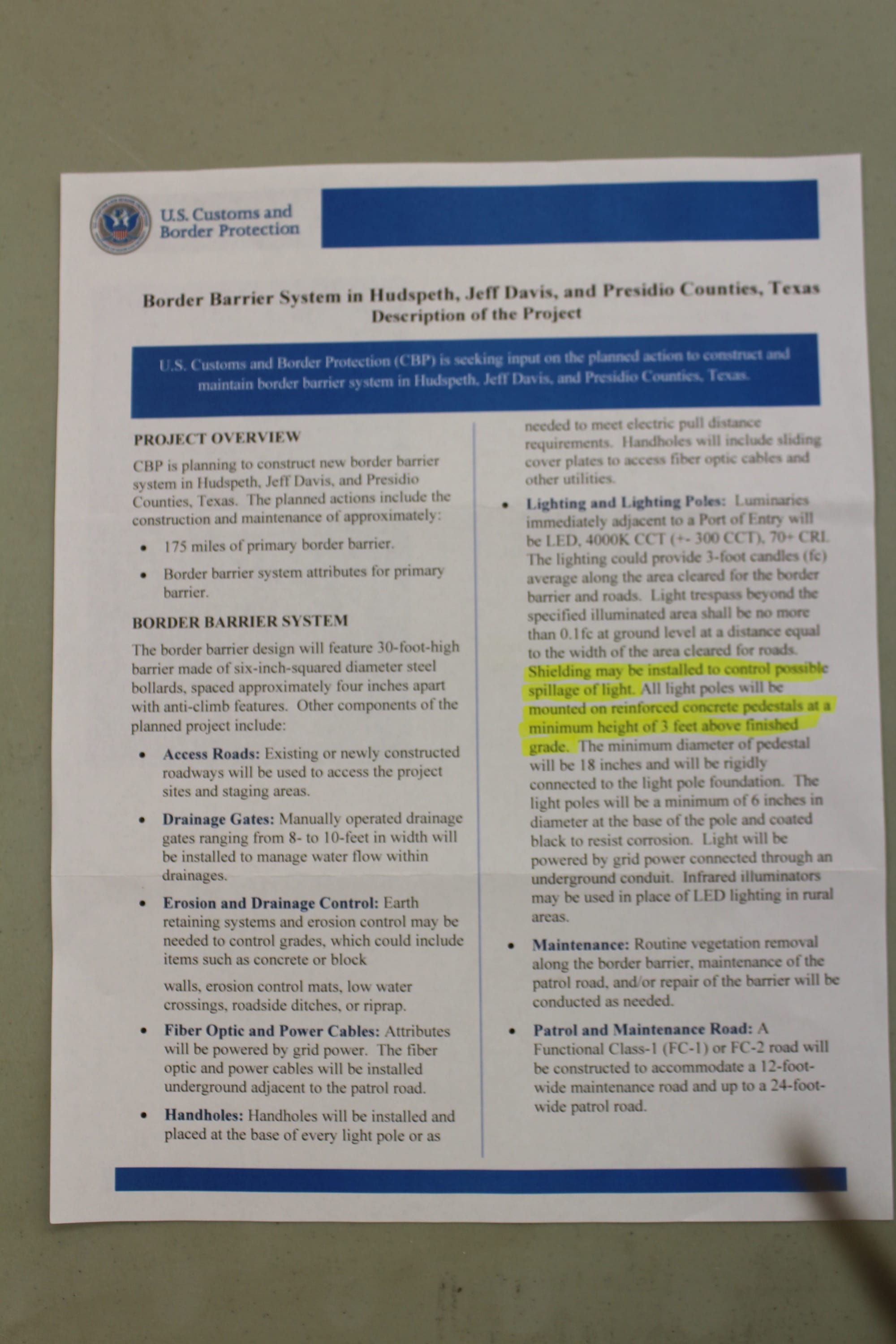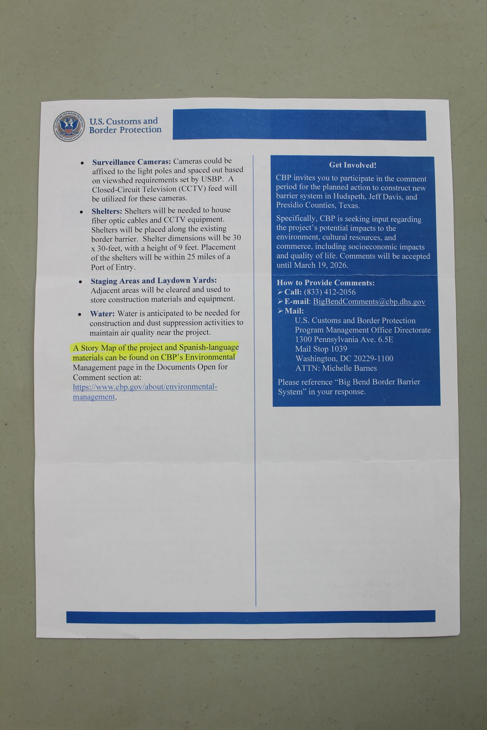 CBP information sheet on border barrier system in the Big Bend Sector.