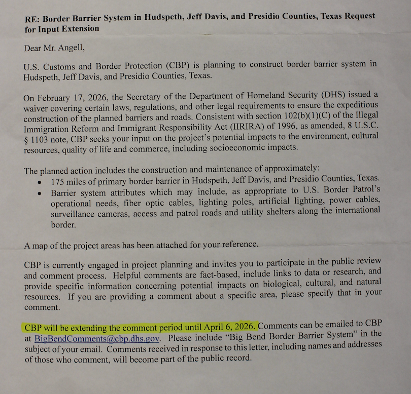 Yeah, around that October 15 waiver, Customs and Border Protection did waivers for all the other sectors in Texas. Those also waived all the financial-transparency laws, but also stuff like the Clean Air and Water Act and the National Wild and Scenic Rivers Act. It was notable to me that they left Big Bend off the initial phase.