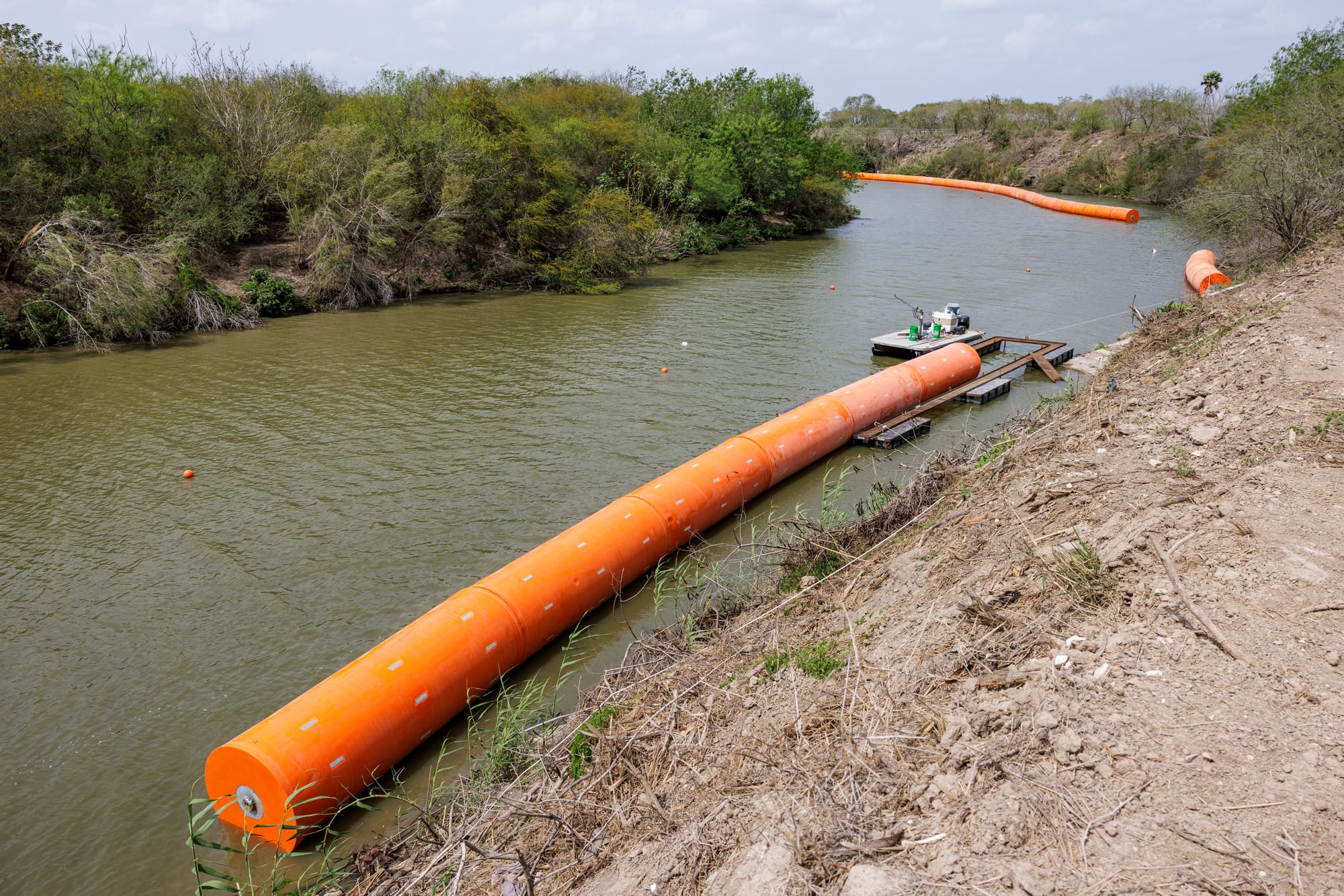 A section of a 17-mile long stretch of buoy barriers floats downriver from the Veterans International Bridge in Brownsville, Texas on March 6, 2026. (Photo credit: Michael Gonzalez)