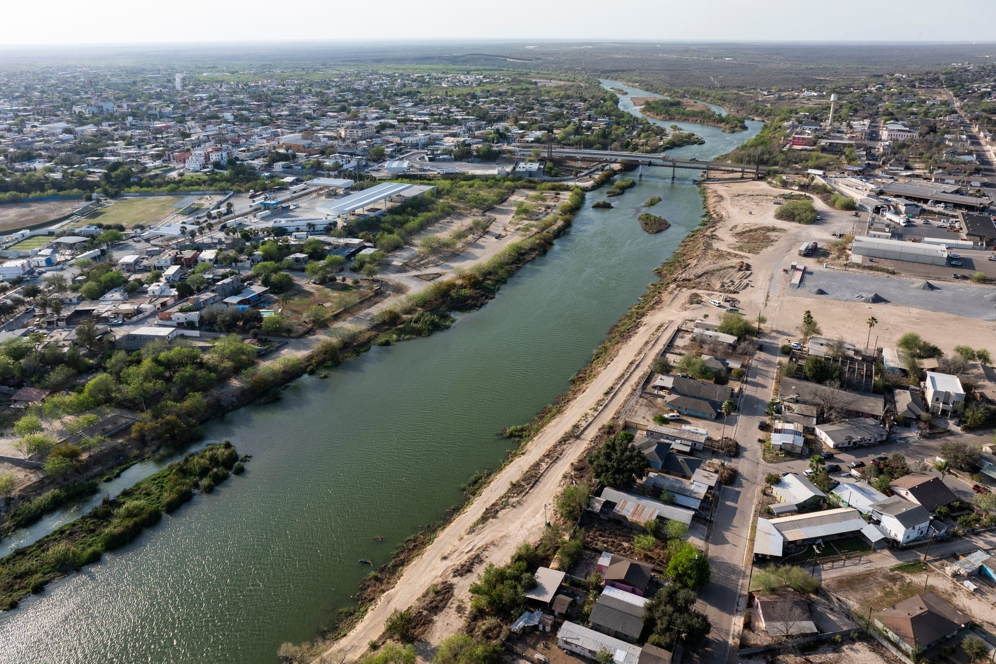 An aerial view of the De La Cruz Colonia, right, where border wall construction is planned along the Rio Grande in Roma, Texas, on March 4, 2026. (Photo credit: Michael Gonzalez)