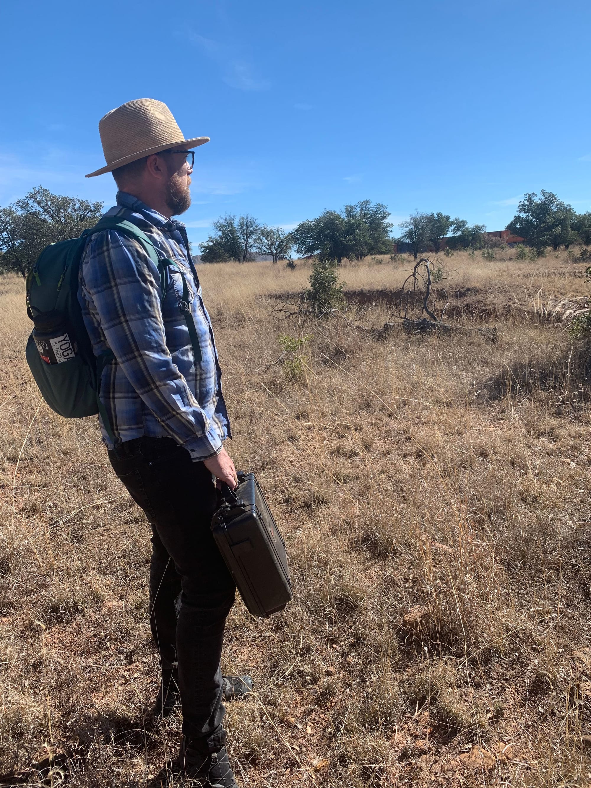 Russ McSpadden in January 2023 at the Arizona-Mexico border preparing to document with a drone the environmental damage caused by a shipping container wall built by former Arizona Gov. Doug Ducey. (Photo credit: Melissa del Bosque)