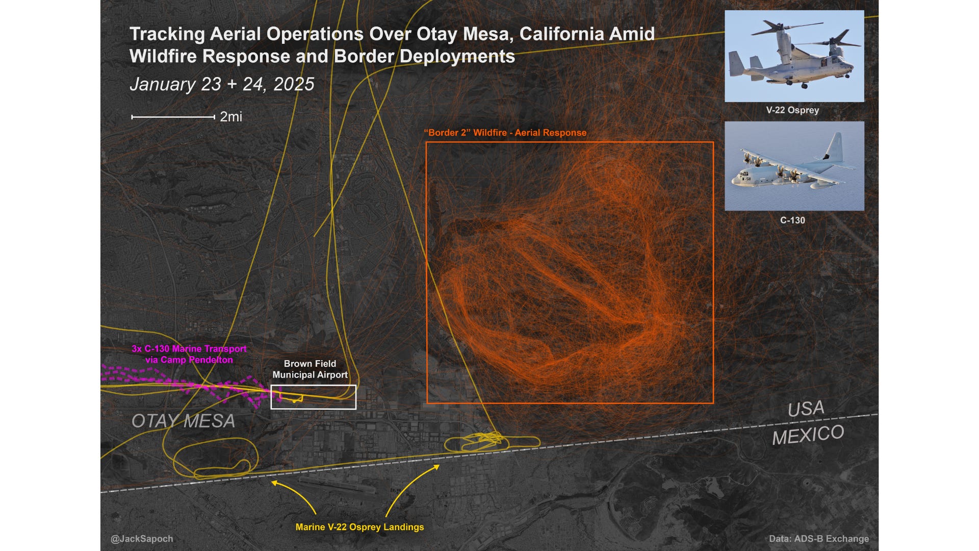 On Friday, the White House released on social media a video of the U.S. Marine Corps landing Ospreys and offloading Marines near Otay Mesa, California. It also disseminated photos of shackled Guatemalan men being loaded onto U.S. military planes.