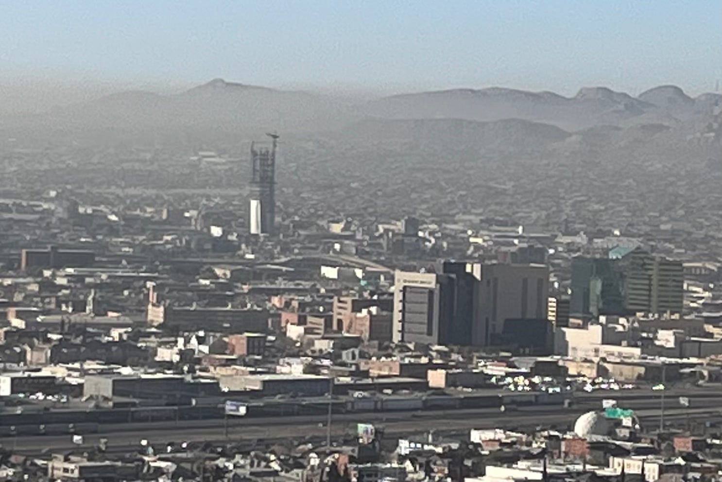 The building in the distance is the Torre Centinela under construction in Ciudad Juárez. Photo taken from the El Paso side in late March. (Photo by Todd Miller).