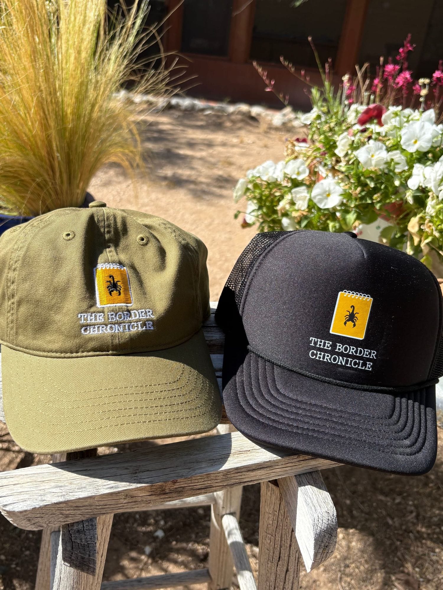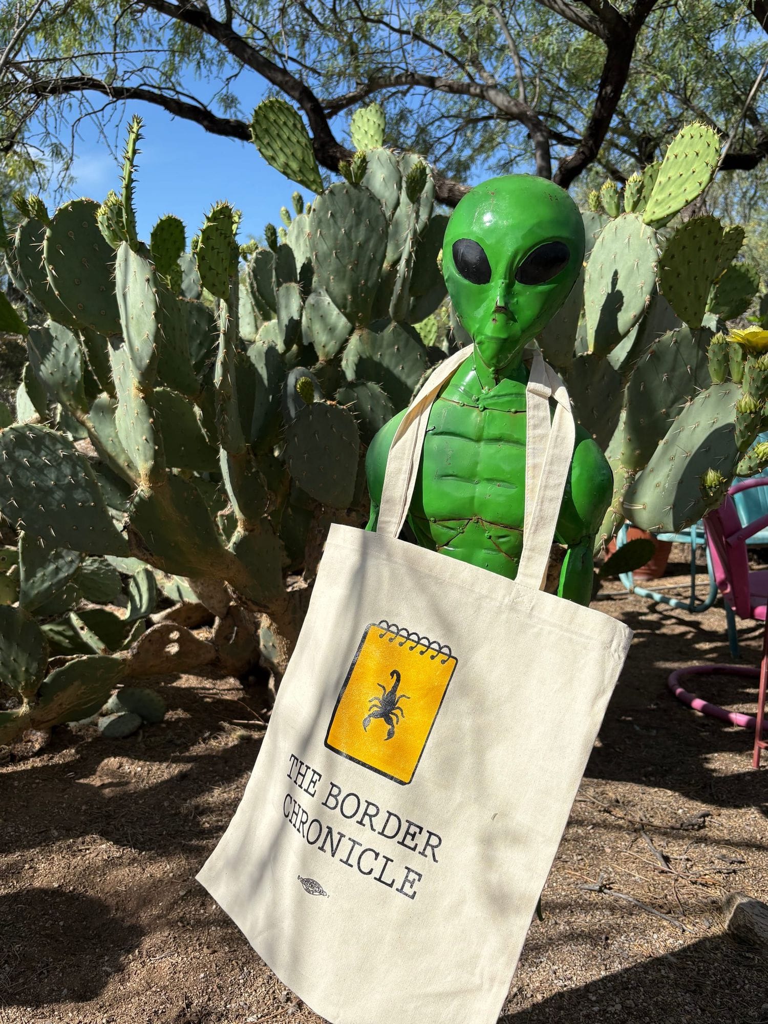 Also, new merch alert! For anyone who signs up today for $59 a year we'll send you a brand new Border Chronicle tote bag, in black or cream color. (Alien six-pack abs not included). For anyone upgrading their subscription to sustaining founder at $250 annual, we'll send you one of our brand new Border Chronicle hats in black (trucker style) or khaki green and a tote bag! Keep the sun out of your eyes and look cool at the same time!