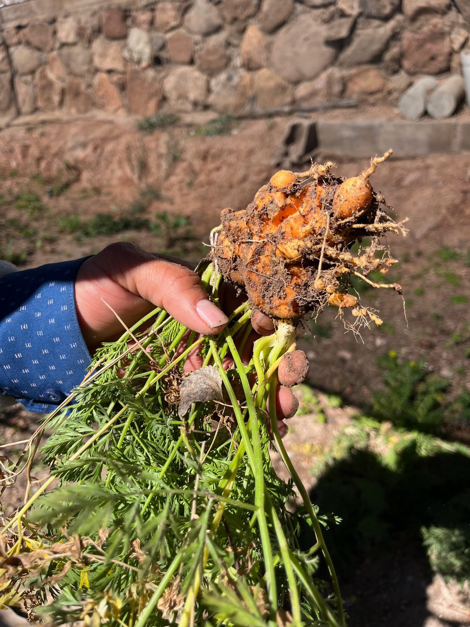 Tomás with a carrot bunch that had been affected by the cold at the garden. (Photo credit: Todd Miller)
