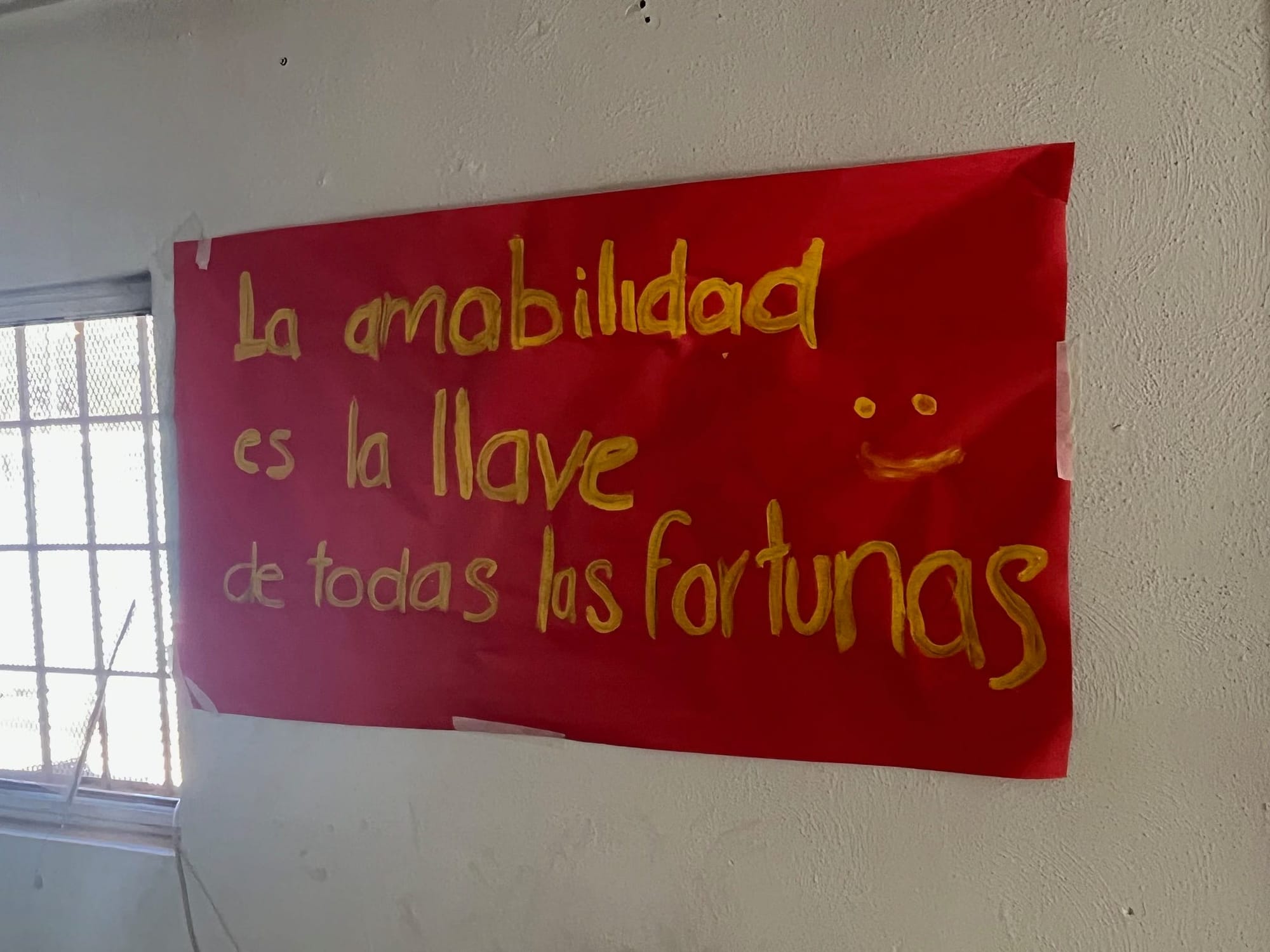 I visited a gigantic bread oven—where people from different countries baked bread in their own traditions, and I visited the kitchen and dining room where banners celebrating the Chinese New Year hung from the walls. One new year celebratory sign read in English, “Be patient, Be light, Be love, Be you!” Another read in Spanish, “La amabilidad es la llave de todas las fortunas” (Friendliness is the key to all fortune).