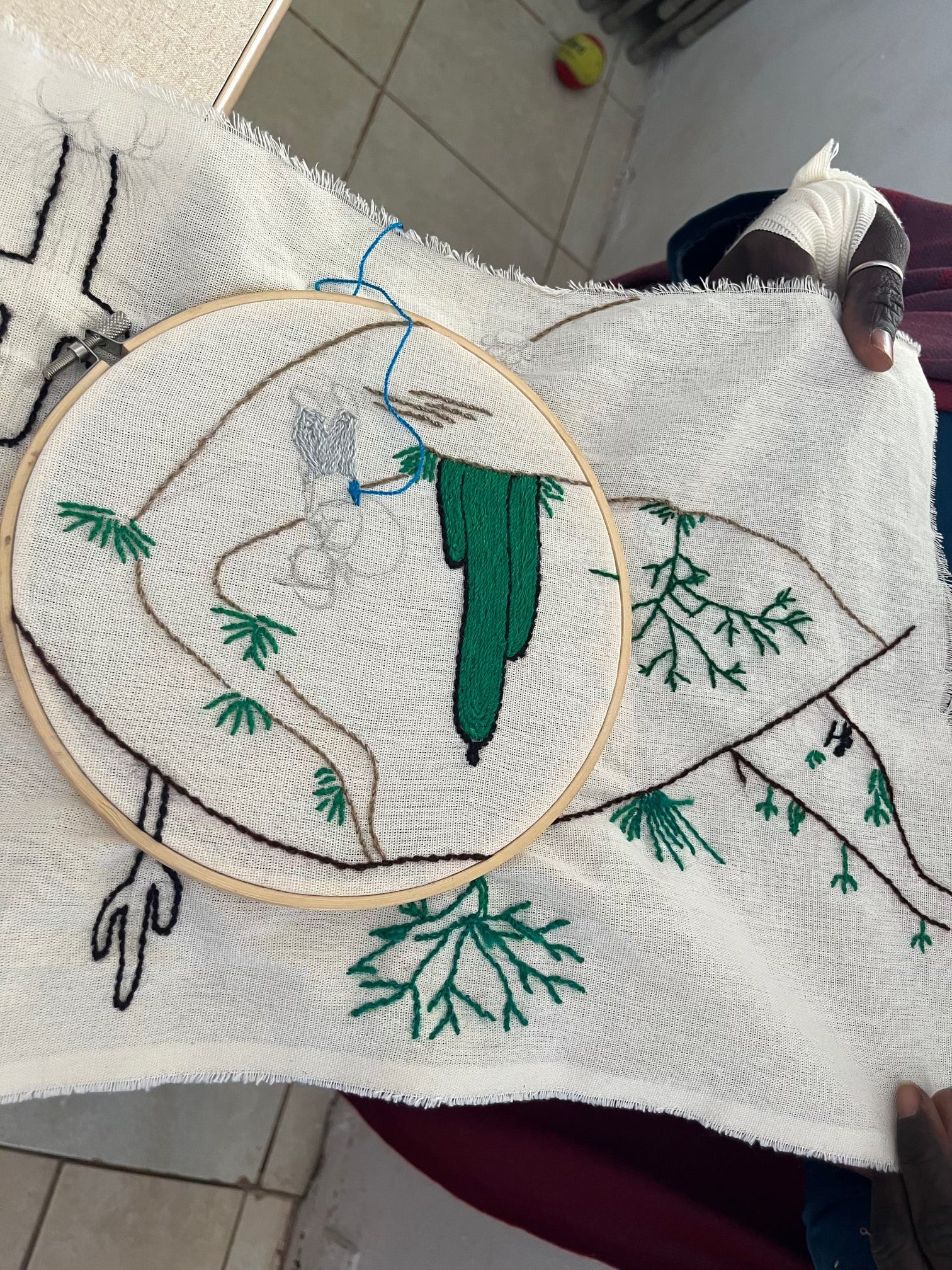 Tomás knelt down to the soil. He showed me the garlic and onions he had planted as an experiment. “Do you want to try a radish?” he asked me in Spanish. “Yes,” I said, “please.” He plucked a radish out of the soil. I wiped off the soil and took a bite. I don’t know if it was because I was hungry (I was), or if it was the force of the stories Tomás and Cristina had shared (probably that too), or just watching Tomás work the soil, tenderly touch the plants, his face soft and concentrated, the perils of asylum-seeker limbo temporarily forgotten, that I knew that this type of care would render something delicious. The radish was so succulent that I finished it too quickly, but I was too bashful to ask for another, even though I wanted one. We could still hear the voices of playing kids coming up from below; there were people from all over Mexico, from Central America, from Peru, Colombia, and from across the world like China, Iran, and Senegal. Before talking with Tomás and Cristina, I visited the tortillería, where three young men worked making tortillas. I visited a workshop where people made weavings and other art projects.