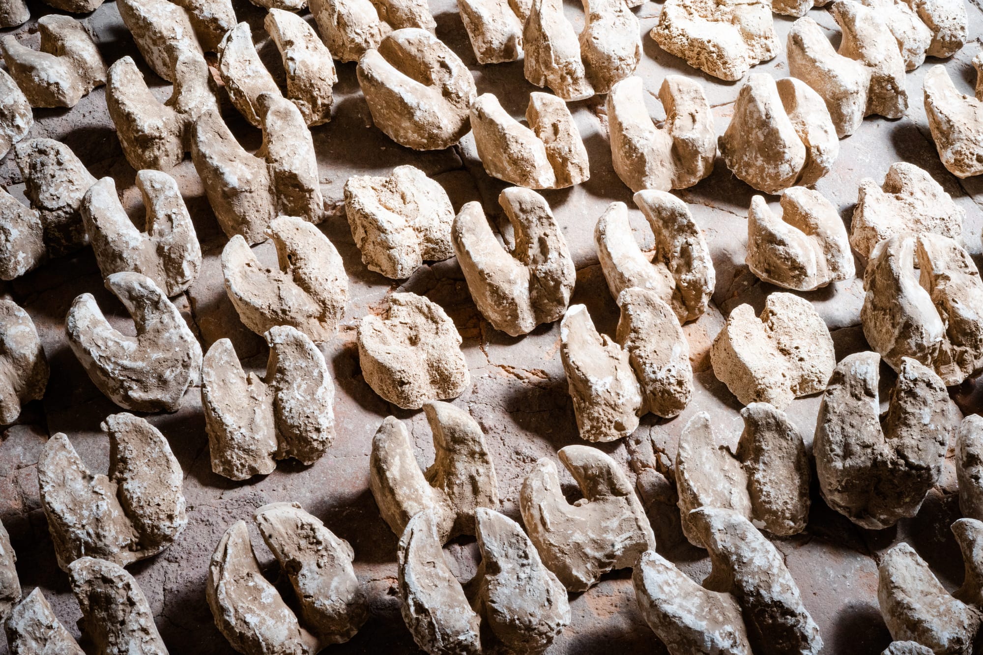 One of the pieces that caught Barrios Giordano’s attention was Marcha, which opens the exposition. The work is comprised of hundreds of casts of cattle hooves spread across the museum’s stone floor. Off-white tinged with the light brown of mud, they evoke a stampede through a soft patch of earth.