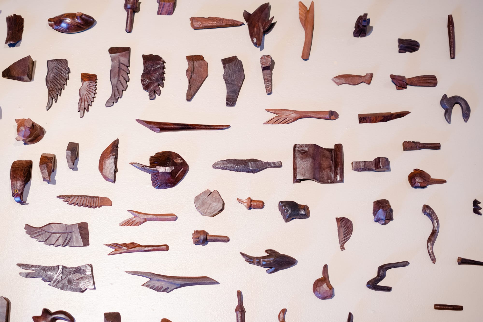 Salado’s installation arranges the ironwood objects from large intact chunks to medium-sized skinned but uncarved pieces, to, finally, smaller carved figures of birds, fish, tools, and wings that were left unsold due to defects. It evokes the same powerful sense of absence and time passing as the hoof casts. Yet it also adds a layer of elegy for change: on the facing wall is Detritos (Detritus), a group of burned, blackened ironwood figures that sit amid charcoal in a ruined jumble. It evokes the increasing number of wildfires that have afflicted the Sonoran Desert in recent years.